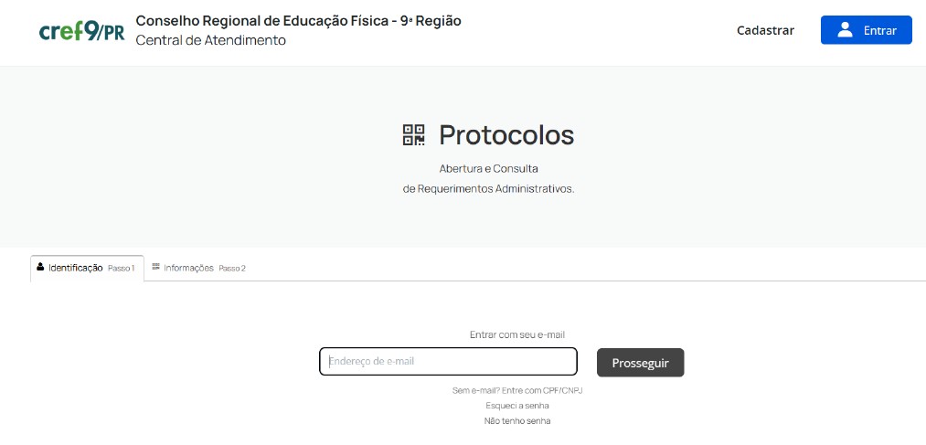 - Insira e-mail cadastrado junto ao CREF9/pr ou cadastre e-mail no sistema (o e-mail da empresa deve ser diferente do e-mail do profissional de Educação Física cadastrado no sistema).