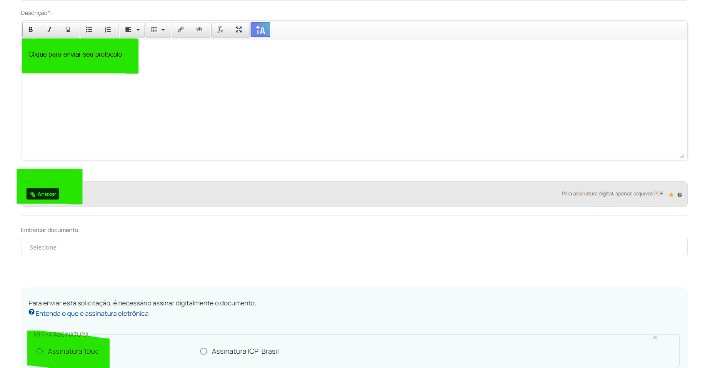 - Após apresentar os esclarecimentos e anexar os documentos necessários (em formato PDF) clicar em: “Declaro, para os devidos fins, sob as penas da lei, que as informações acima são verdadeiras e de minha inteira responsabilidade”, assinar digitalmente e protocolar.